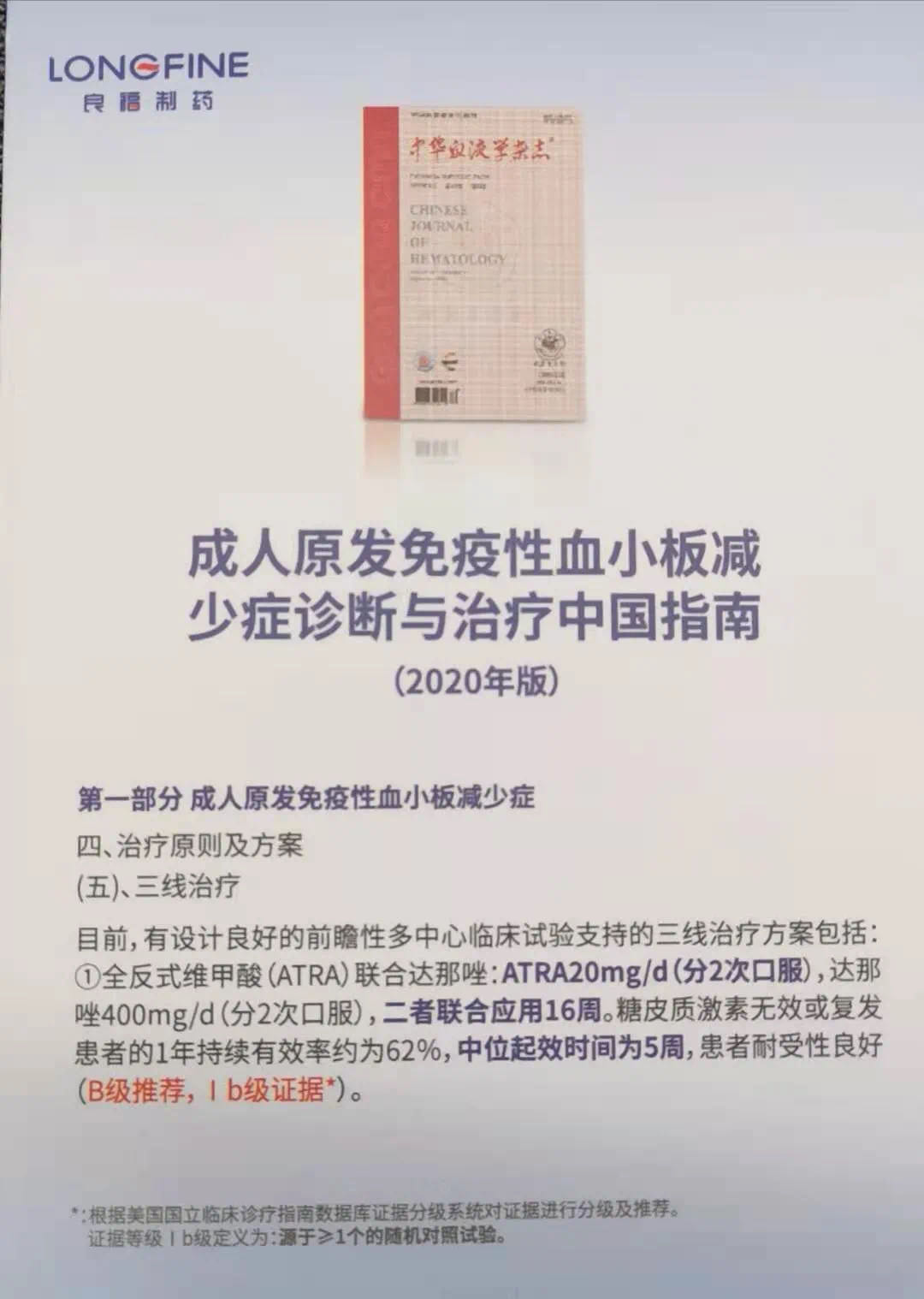 2019年9月,全反式维甲酸成功进入“成人原发性免疫性血小板减少症诊断与治疗中国指南(2020版)”,为我国血小板减少患者提供了一个新的治疗方案。