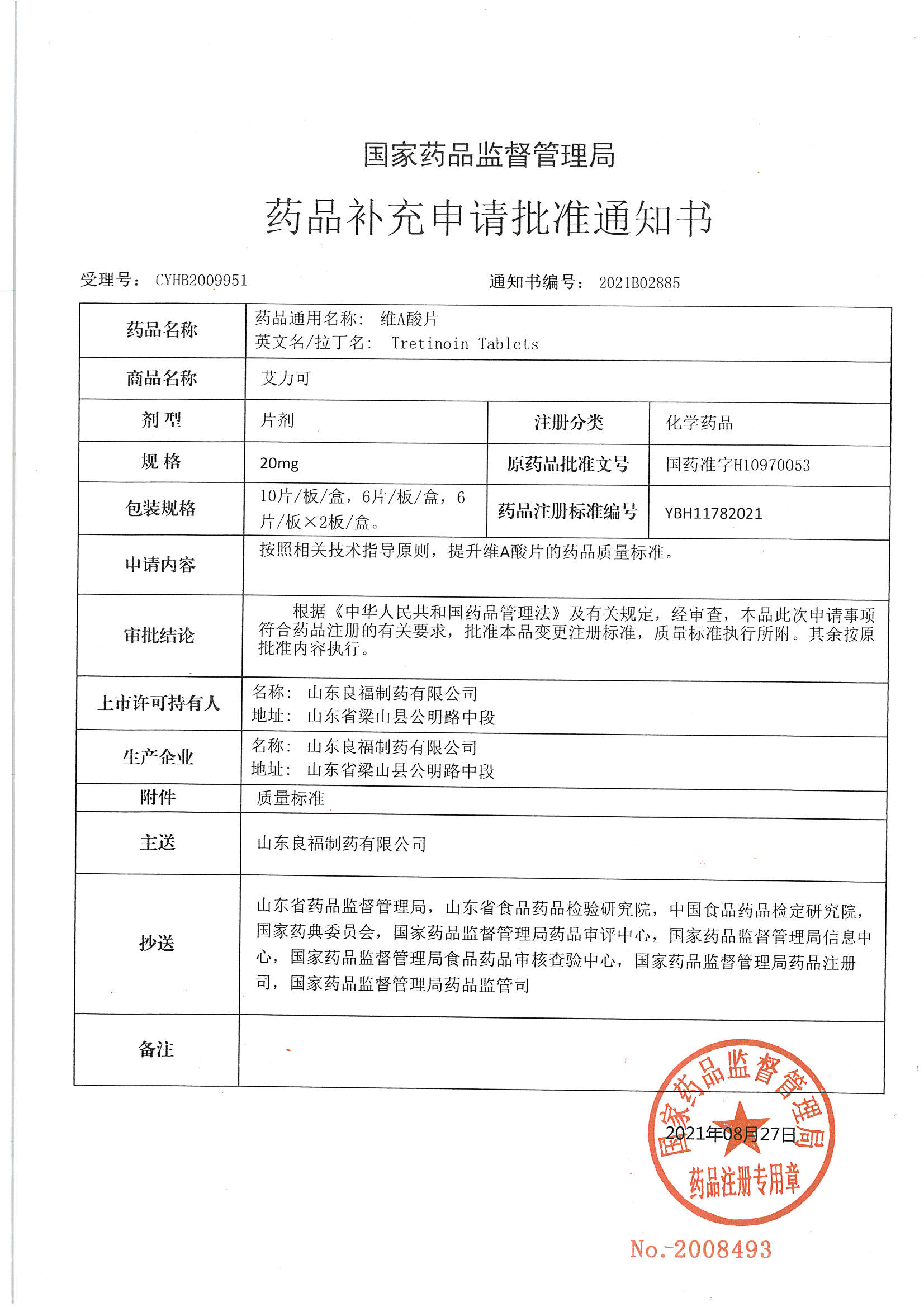近日,我公司收到国家药品监督管理局核准签发的《药品补充申请批准通知书》,批准公司产品“良福艾力可”维A酸片的药品质量标准提升申请,标志着“良福艾力可”维A酸片的质量再上新台阶,处于世界领先水平!