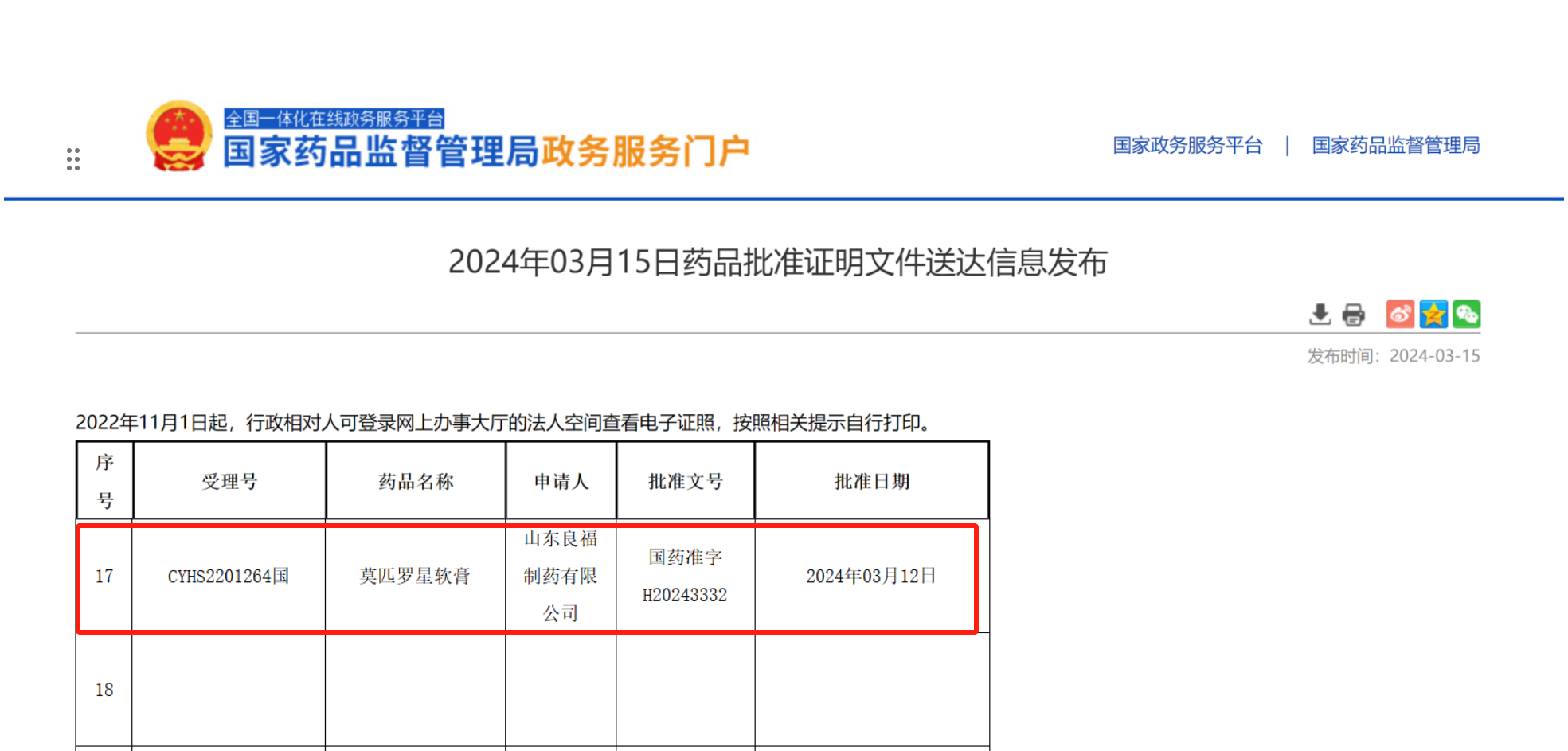 2024年3月15日,国家药监局发布药品批准证明文件通知,良福制药莫匹罗星软膏获得国家药监局批准上市。
