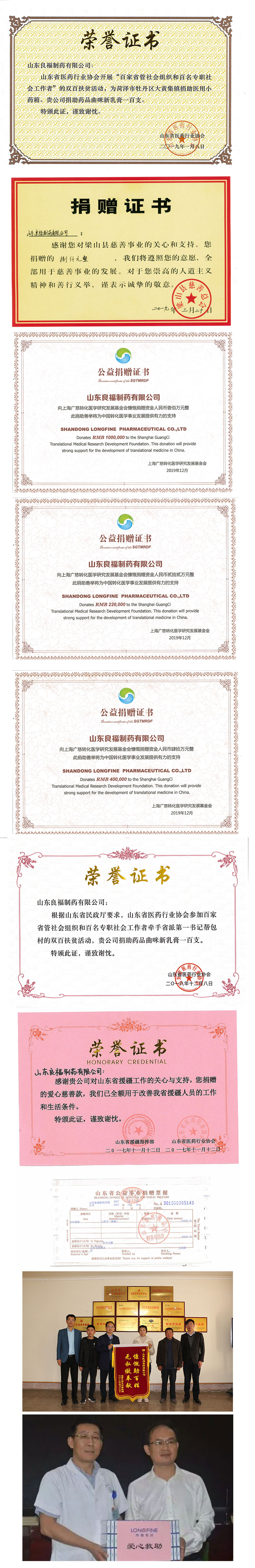 2020年1月-3月份,在新冠肺炎防疫期间向社会捐赠免洗手消毒凝胶3000余瓶价值10万元(县医院800瓶、梁山火车站100瓶、梁山汽车站100瓶、梁山县机关事务局100瓶、梁山县教育局200瓶、梁山县民政局1300瓶)