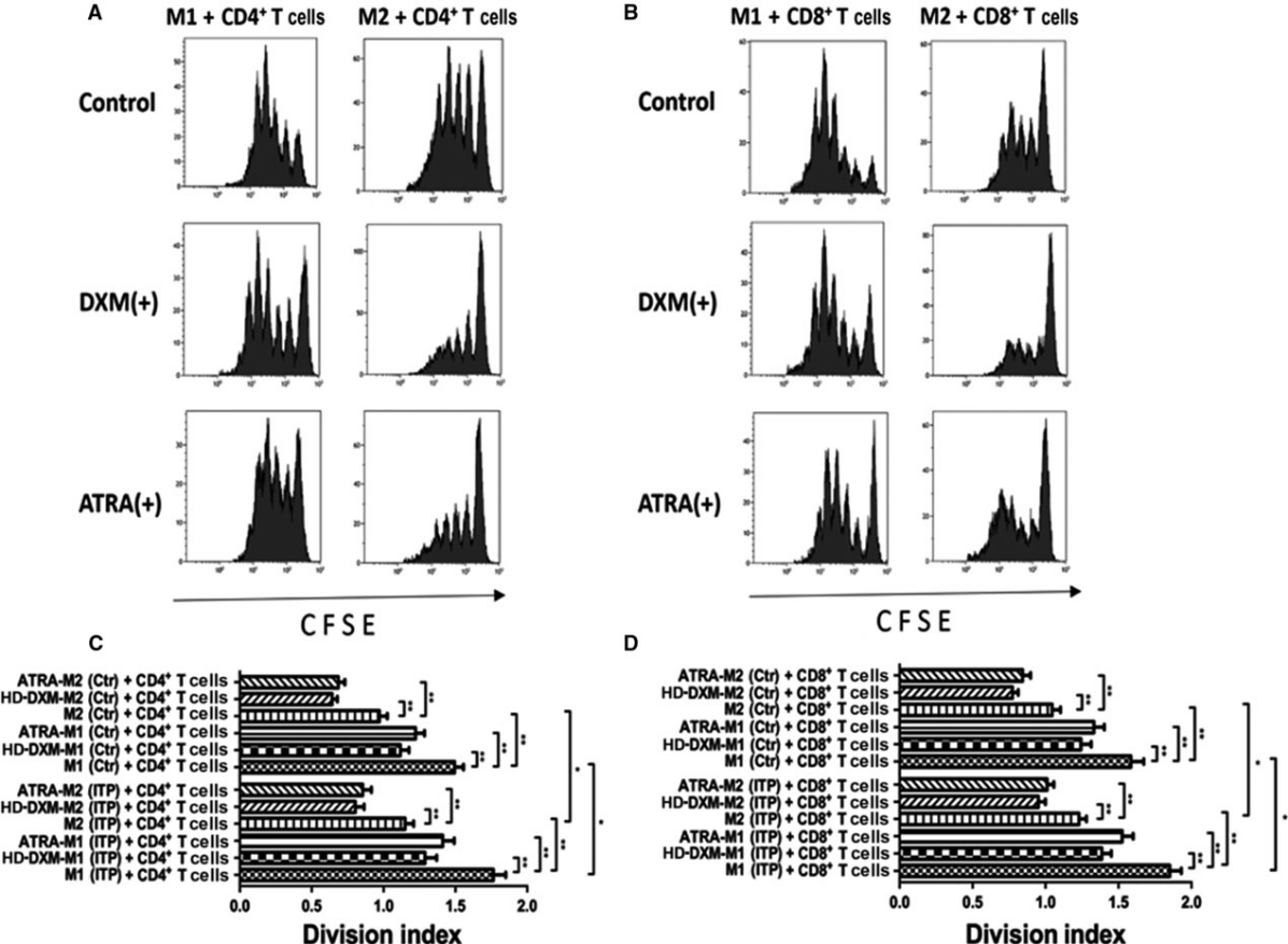 1.与健康对照组相比,ITP患者诱导的M1和M2巨噬细胞均有刺激T细胞增殖的作用。HD-DXM或ATRA处理的M1和M2巨噬细胞均显著抑制CD4+T细胞增殖,同时也抑制CD8+T细胞的分裂。