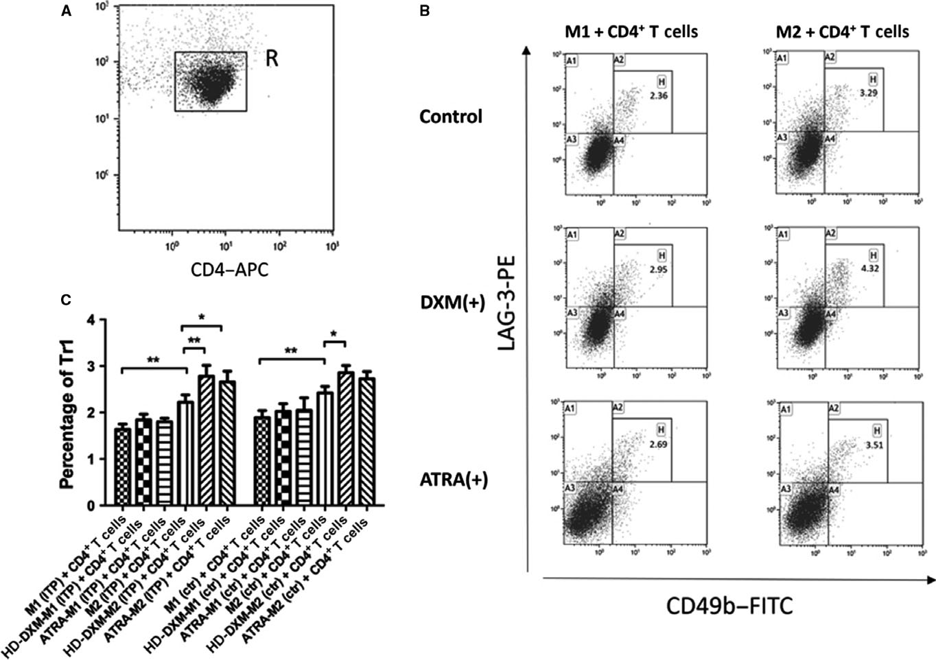 3.HD-DXM或ATRA均能改善ITP患者M2巨噬细胞诱导Tr1细胞生成的能力。