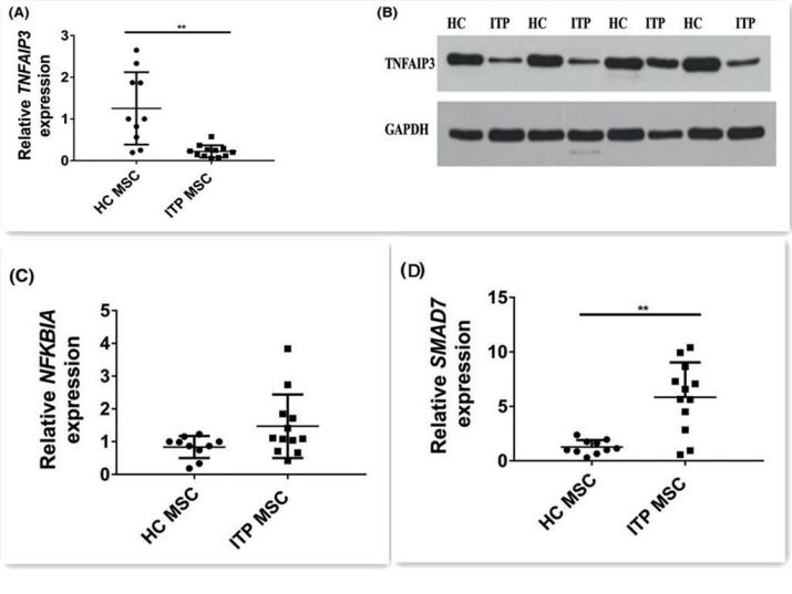 2.ITP骨髓间充质干细胞中TNFAIP3的表达较对照组显著降低,NFKBIA mRNA的相对表达水平较对照组升高,抑制蛋白SMAD 7的表达较对照组上调。