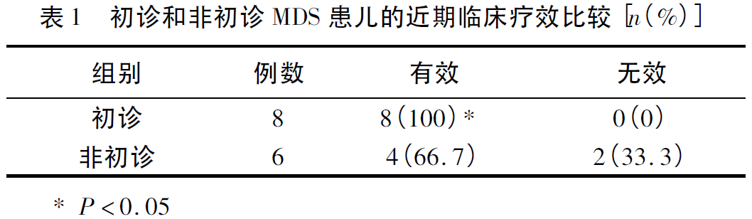 该研究纳入哈尔滨市第一医院血液儿科住院的14 例MDS患儿,其中6例为非初诊治疗病例,既往均曾长期间断应用CsA等药物治疗。其中11例RCC患儿的初始治疗采用低剂量ATO/ATRA的诱导缓解方案治疗。ATO注射液0.08 mg/kg静点,1次/d(最多不超过5mg/d),d1-28;ATRA片(山东良福制药)10-20mg/m2/d,分两次口服,d1-28。3例RAEB患儿在ATO、ATRA单药或联合诱导缓解方案的基础上,同时联合应用低剂量Ara-C 5-10mg/m2/d(最多不超过10mg/m2/d) 皮下注射或静点,d1-7或d1-14。治疗时间至少达到1个疗程以上,进行疗效评估。