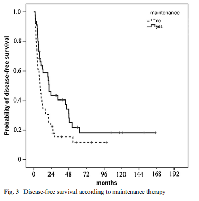 维持治疗组与对照组5年无病生存率分别为21.8 %和 11.5%;中位无病生存时间分别为21.2 月和 8.7月( p=0.017 )